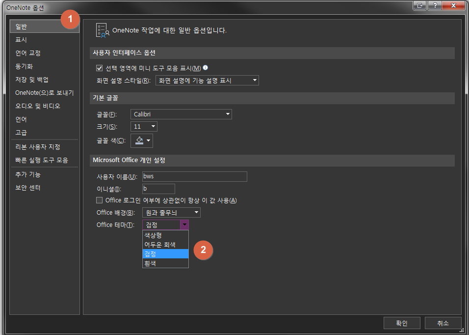 우리 눈은 소중하니까 원노트를 검은색으로 바꿔주는 테마 변경을 해주는 방법이다.