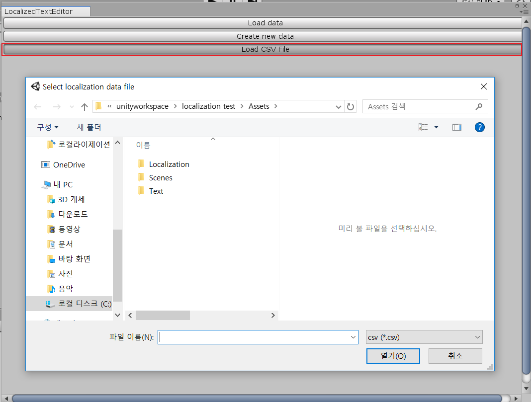윈도 창에서 Application.dataPath 경로에 해당하는 부분으로 열어준 다음에 csv 파일 확장자를 불러온다.