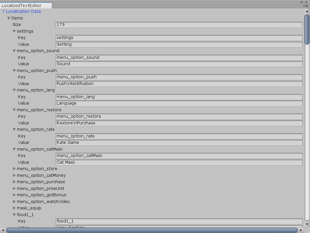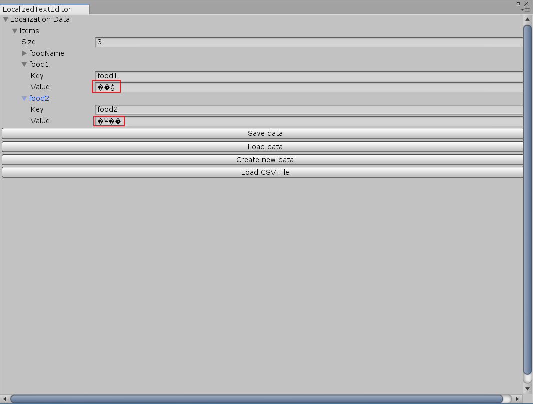 읽어낸 데이터를 다시 쉼표(,)로 스플릿 하여 키와 밸류로 분리한 뒤 Serializable 클래스 LocalizationData의 Items에 LocalizationItem으로 삽입을 한다.