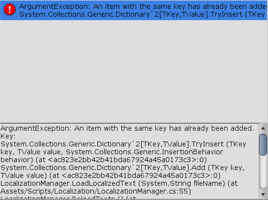 if (!localizedText.ContainsKey(loadedData.items[i].key)) 이 부분으로 예외처리를 해서 문제는 발생하지 않을 것이다.
