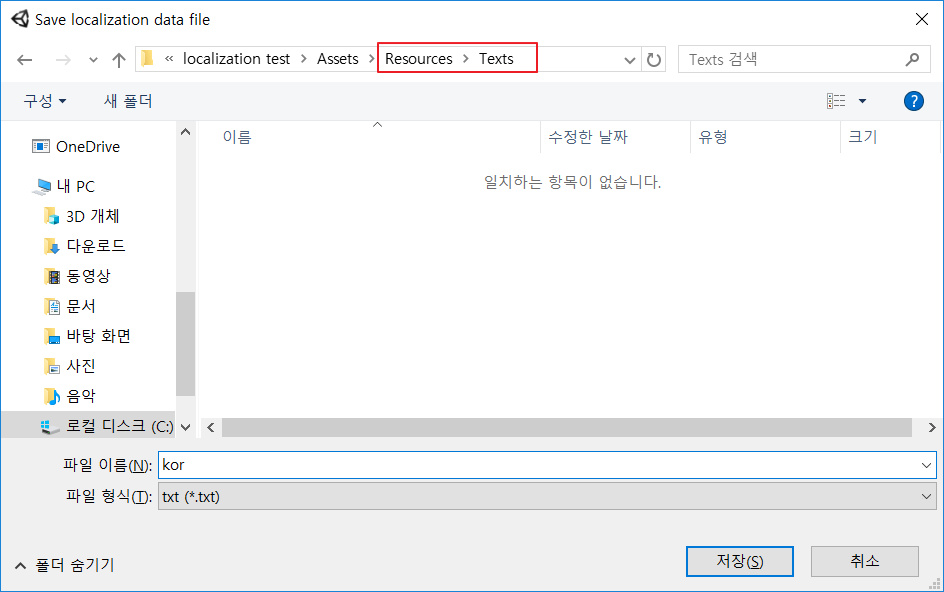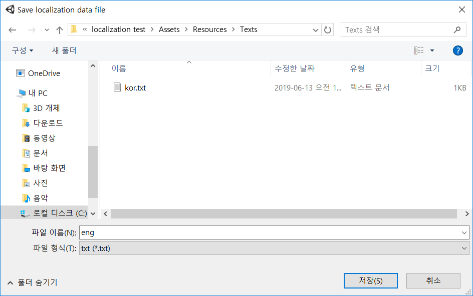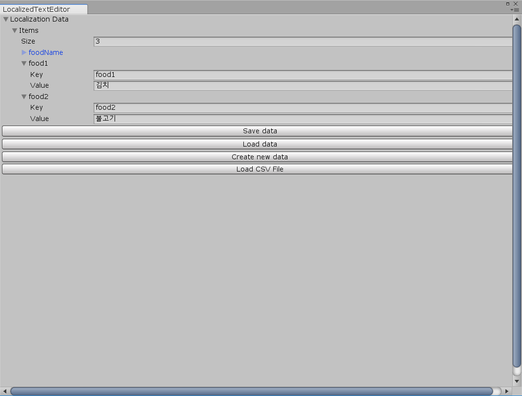 1. 유니티 에디터(LocalizedTextEditor)를 통하여 csv 파일을 json 형태의 txt 파일로 저장한다.