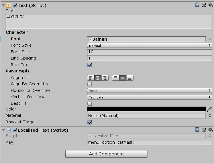 나중에 다시 설명을 할 것이지만 로컬라이제이션 세팅을 하고 나면 text 컴포넌트에 Localized Text 컴포넌트를 붙이고 텍스트에 해당하는 key값을 적어주면 알아서 언어 값에 따라서 바뀐다.