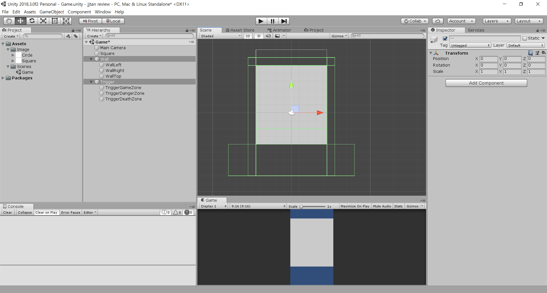 프로젝트의 기본 틀을 만들고자 한다. 목표는 아래와 같이 박스 콜라이더 2D와 트리거를 만드는 것 이다.