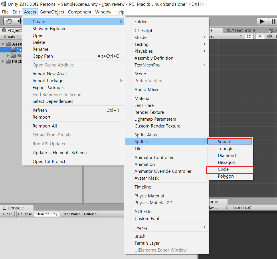 Create > Sprites > Square, Circle을 눌러 생성한다.