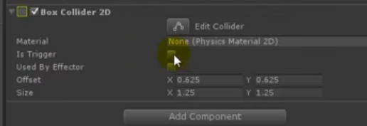 다음은 콜라이더를 만들어야하는데 똑같은 방식으로 만들어주고 Box Collider2D 컴포넌트에서 Is Trigger를 체크해준다.