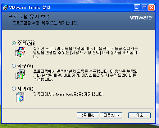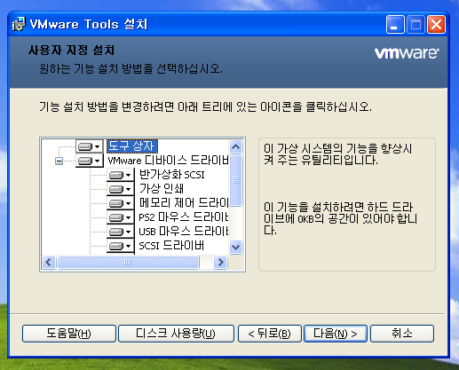 찾아보니 xp에서 usb 마우스를 잘 지원 안 해서 그렇다는데 아래와 같이 vmware tools를 설치해주면 정상적으로 작동한다.