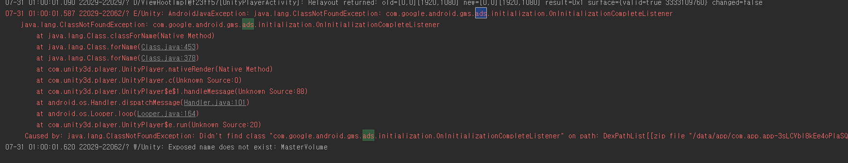2. 앱 빌드, 실행 시 AndroidJavaException: java.lang.ClassNotFoundException: com.google.android.gms.ads.initialization.OnInitializationCompleteListener 오류