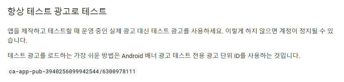 요건 나도 몰랐던건데 애드몹에서 광고 작동 테스트를 하려고 광고 호출할때는 항상 테스트 광고를 사용하라는 경고가 있다.