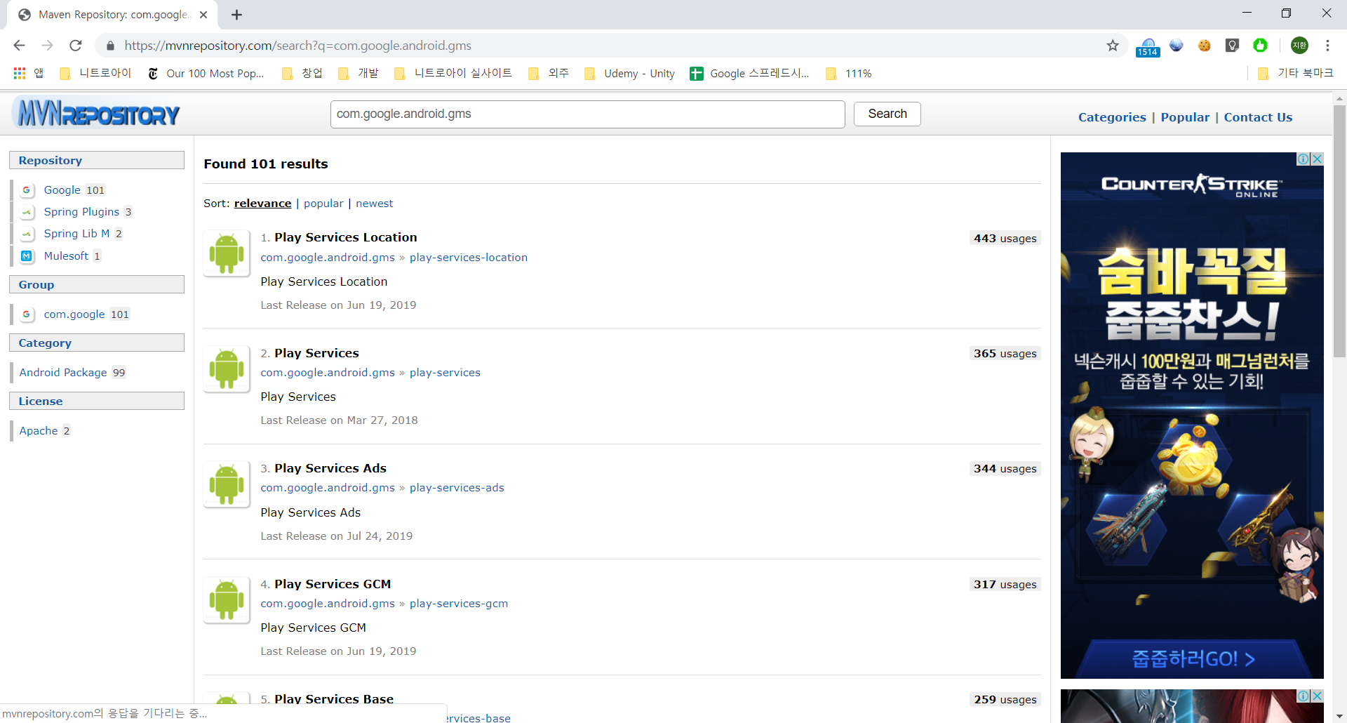 검색 결과가 매우 많다. gms 아래에 다양한 서비스가 존재해서 그렇다.