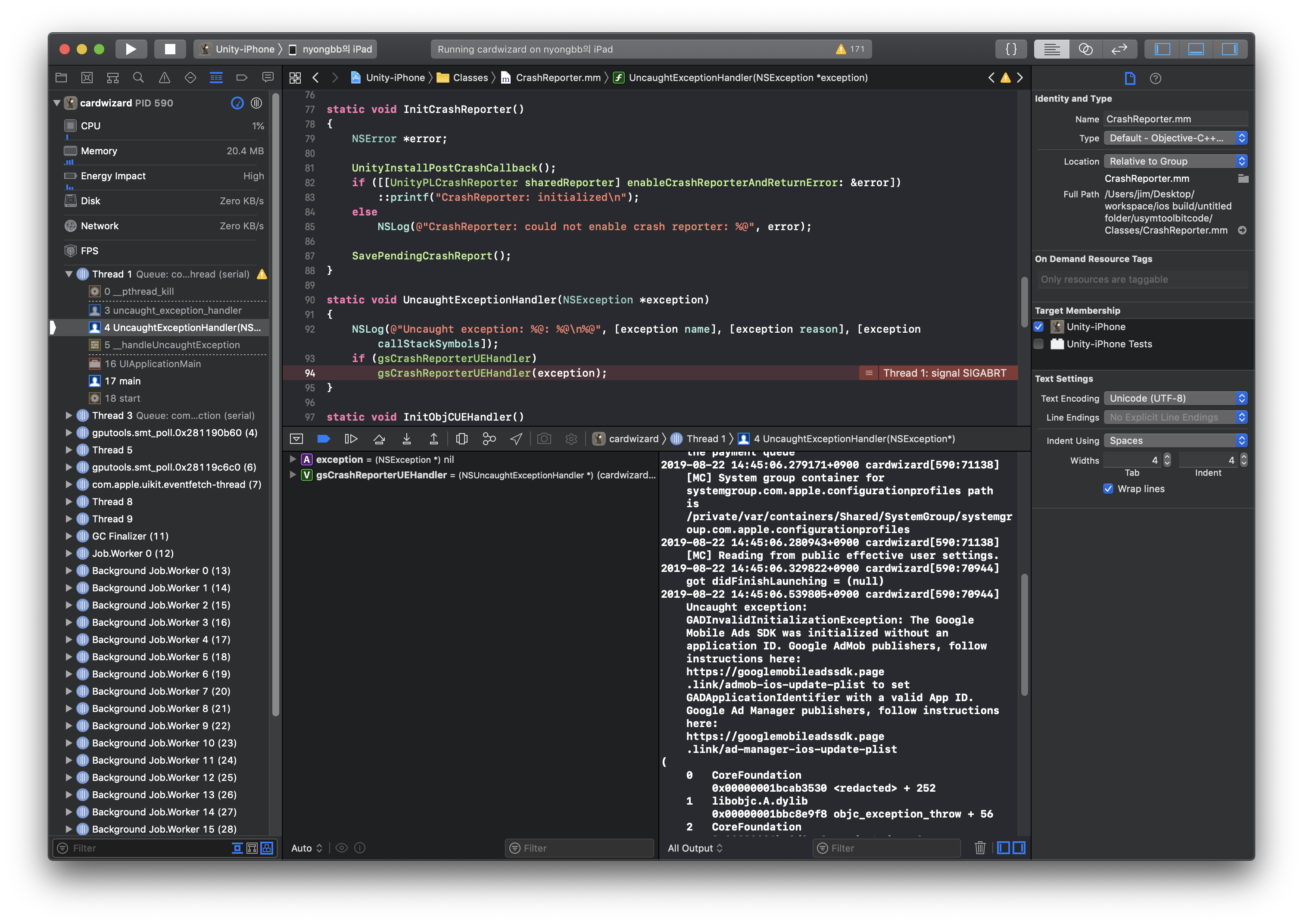 실행하면 gsCrashReporterUEHandler 에서 오류가 잡히는데 이 오류가 뜨면 빌드까지는 됐는데 앱 실행하고 나서 오류가 발생하는 것이다. 콘솔을 보면 GA 키값을 입력 안 했는데 이 오류가 뜨면 대부분 plist에 써드파티 sdk 키값을 입력하지 않아서 발생한다.
