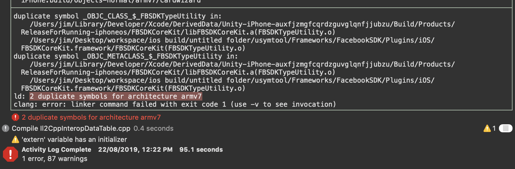 duplicate symbol _OBJC_CLASS_$_FBSDKTypeUtility duplicate symbols for architecture armv7 clang: error: linker command failed with exit code 1 (use -v to see invocation)
