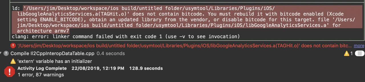 나의 경우 GA가 비트 코드가 없는 버전인데 비트코드가 있는 sdk로 교체를 해주던가 빌드 옵션에서 꺼주면 된다.