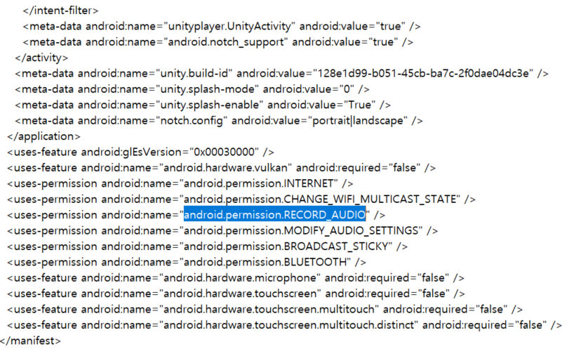 파일에 application 태그 안에 <meta-data android:name="unityplayer.SkipPermissionsDialog" android:value="true" /> 를 추가해준다.
