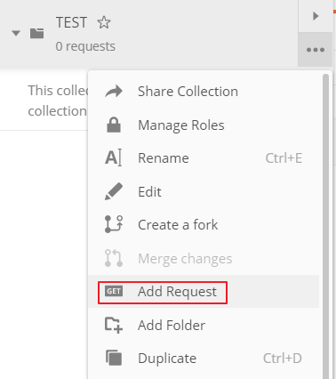 생성된 Collection의 ...을 클릭하고 Add Request를 클릭한다.