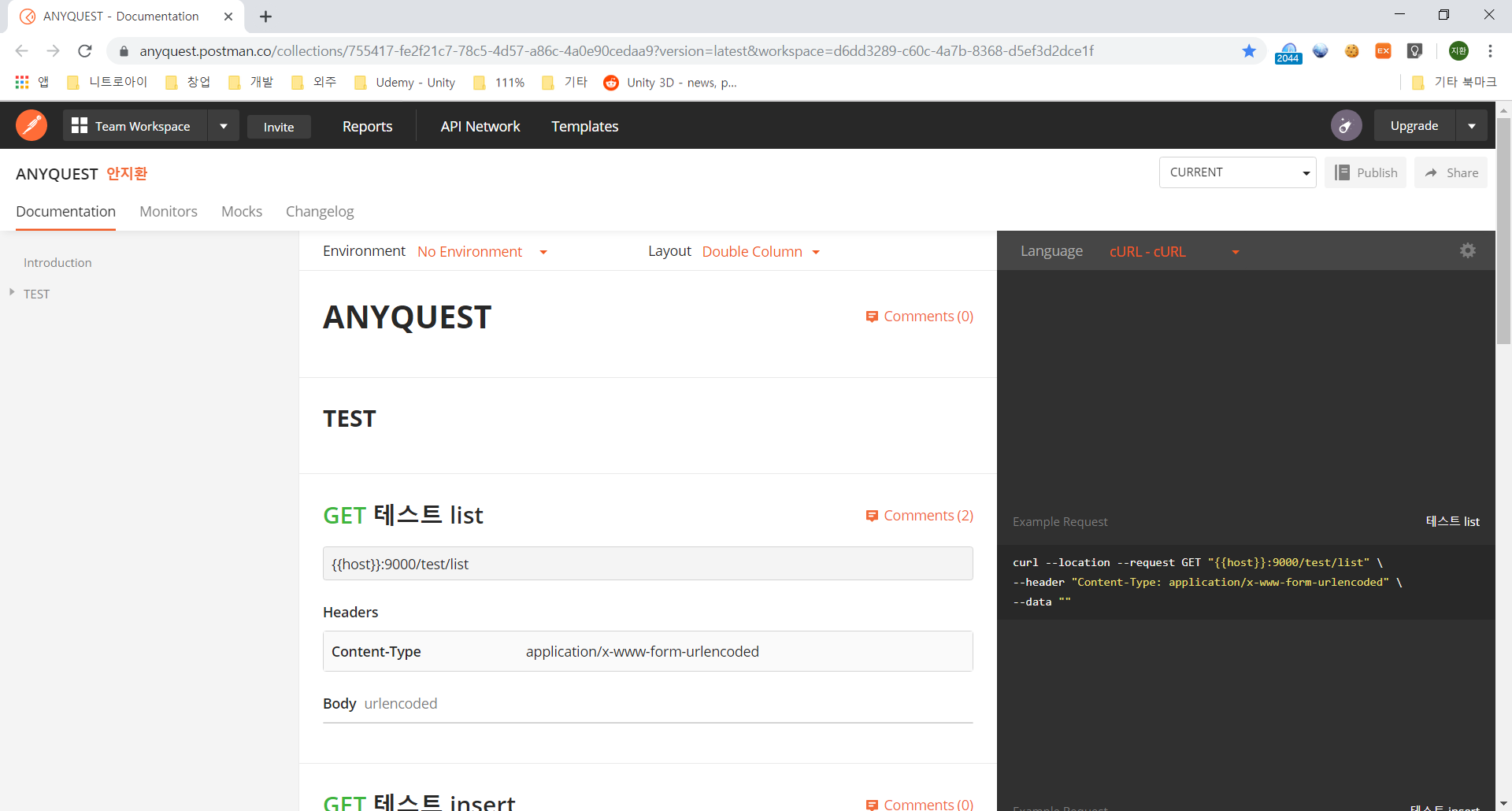 저기 보이는 주소를 테스트 주소로 바꾸고 다시 실서버로 바꾸고 귀찮게 해야 하는데 포스트맨은 서버 주소 같은 환경변수를 손쉽게 변수로 빼서 API 작성이 가능하다.