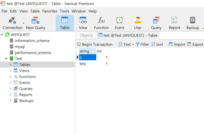 string(VARCHAR, PK), int(INT) 필드가 있다.