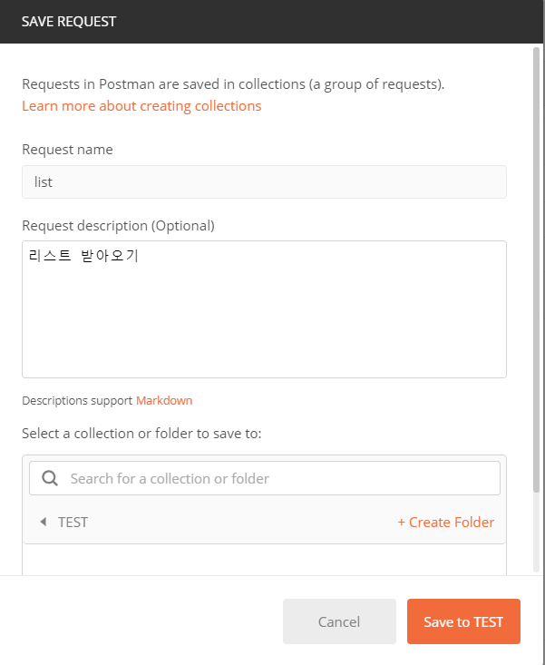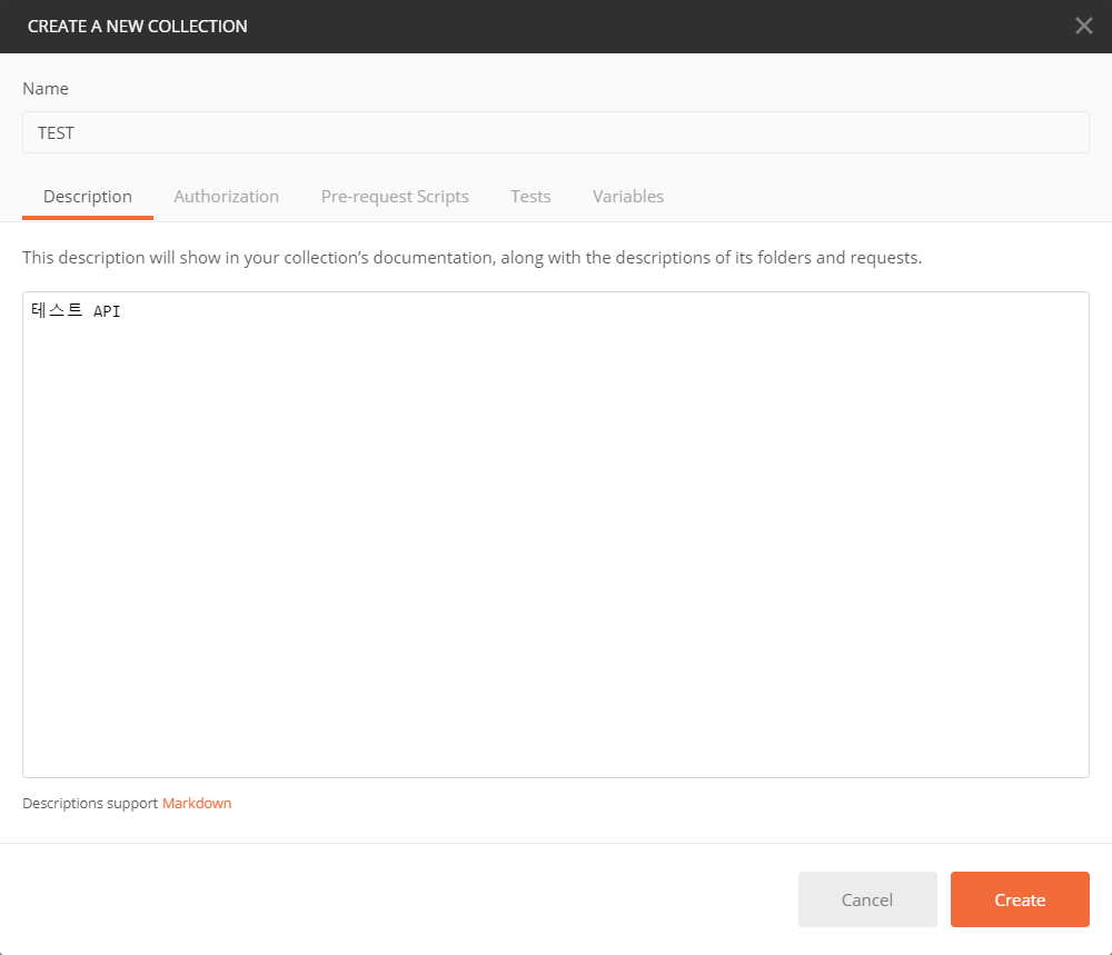 포스트맨에서 Collections > New Collection > Create new Collection을 클릭