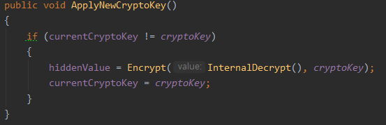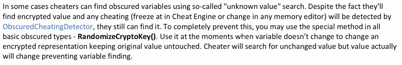 암호화 된 값을 바꾸는 기능은 Obscured 객체에 딸려있는 RandomizeCryptoKey 함수를 이용하면 된다.