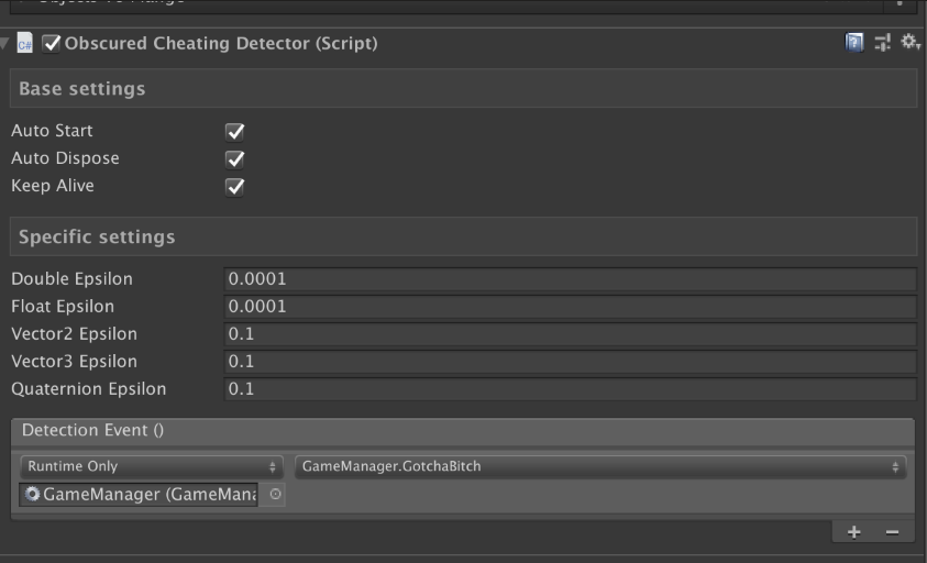 게임 오브젝트에 Obscured Cheating Detector를 만들어두고 Detection Event에 함수를 달아놓는다.