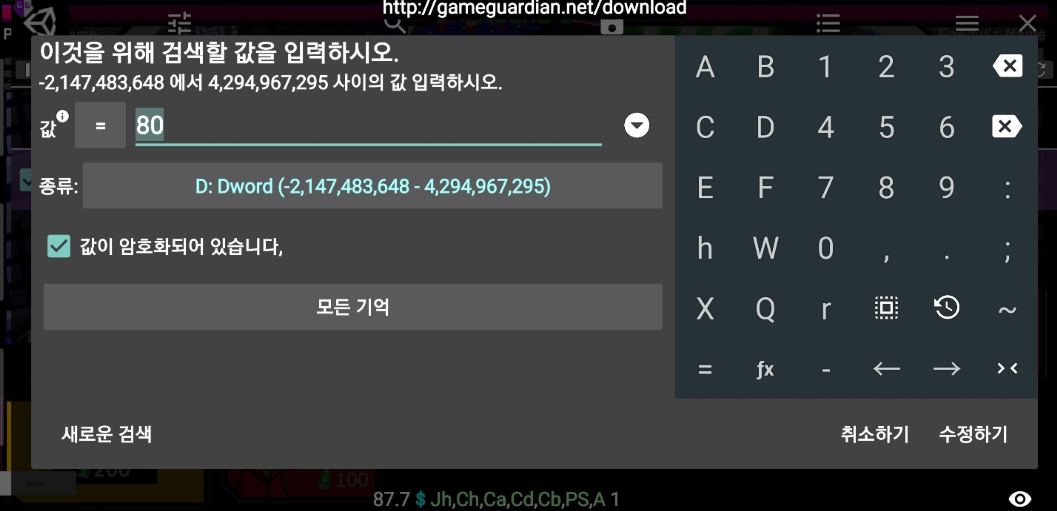 그러면 이제 암호화를 했는데 게임 가디언으로 한번 메모리 변조를 시도해보겠다.