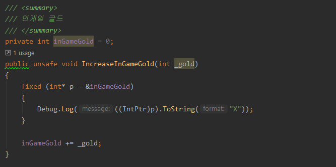inGameGold라는 private 변수의 메모리 주소를 받아와서 출력해준다.