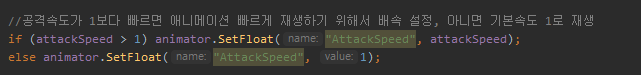만약에 버프나 통하여 공격 속도가 1보다 빨라지면 애니메이션의 재생속도도 빨라진만큼 배속을 해줘야하고 공격속도가 디버프를 통하여 1보다 느려지면 기본 속도로 재생을 시켜주고 남은 시간은 기다리도록 하면 된다.
