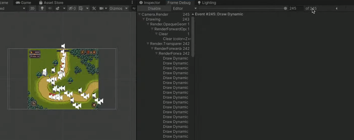 프레임 디버거를 이용한 드로우 콜 최적화 예시) 타워 디펜스