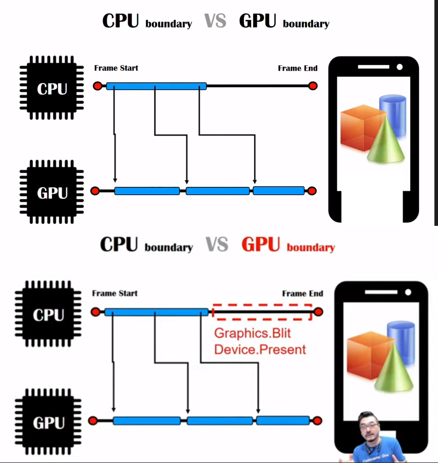 위의 경우는 GPU 바운드 -> CPU는 할 일이 없지만 GPU에 할일이 많아서 렉걸림