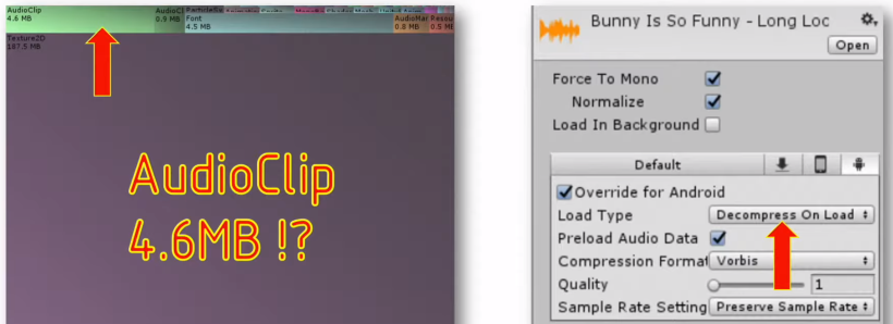 오디오 클립도 메모리에 올라갔을 때굉장히 큰경우가 있는데 Decompress On Load는 음악 압축을 풀어서 메모리에 올리기 때문에 를 바꾸자.
