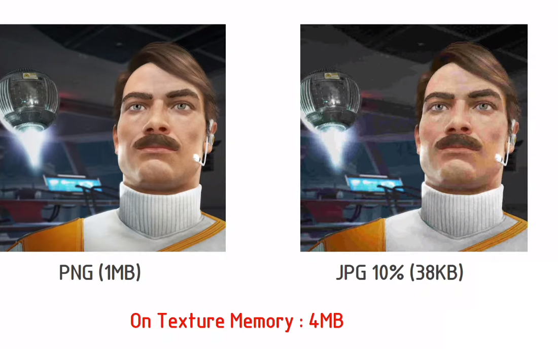 그 이유는 PNG, JPG, PSD로 저장되는 텍스쳐의 용량은 단순히 PC에서 저장되기 위한 용량을 말하는 것이지 GPU에서 사용하기 위한 포맷이 아니다.