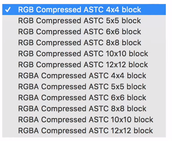 ASTC(Adaptive Scalable Texture Compression)라는 자유롭게 압축 단위를 바꾸는 압축 기법도 있다.
