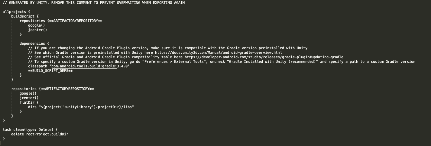 유니티의 gradle 버전이 3.4.0 인데 버전이 낮아서 그렇다고 한다.