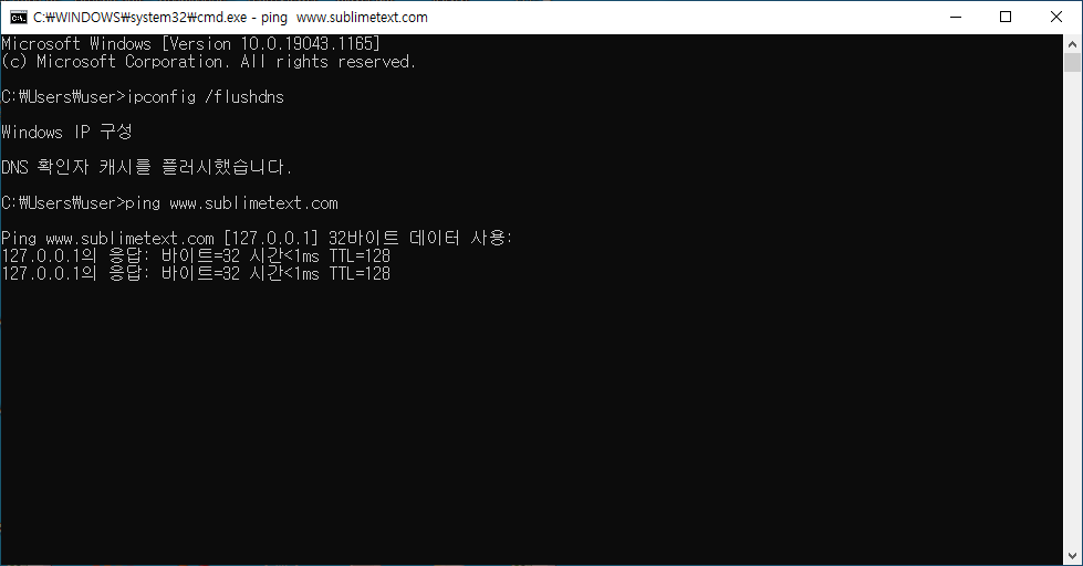 그 다음 ipconfig /flushdns 명령어로 새로고침 하고 ping www.sublimetext.com을 했을때 127.0.0.1을 가리키면 끝이다.
