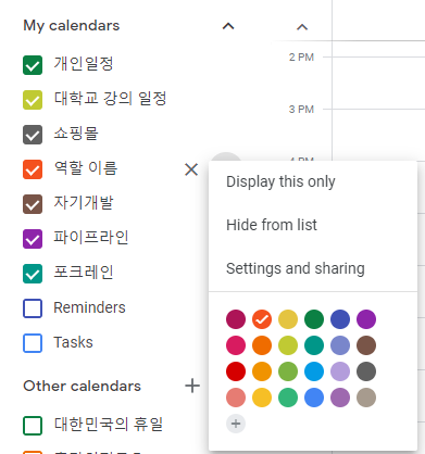 나로 예를 들자면 맡고 있는 프로젝트 2개, 대학교, 쇼핑몰 이렇게 4개의 캘린더를 생성했다.