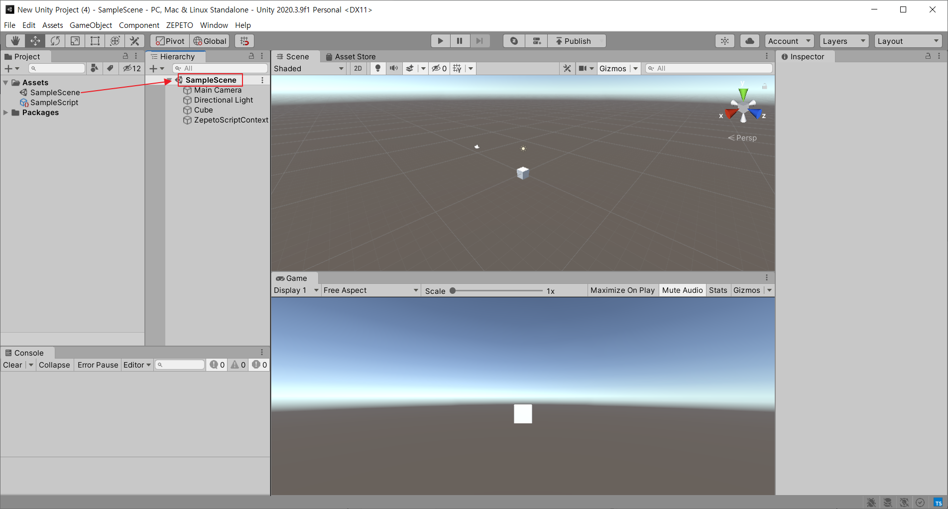 에셋에서 샘플씬을 더블클릭해서 씬으로 진입한다.