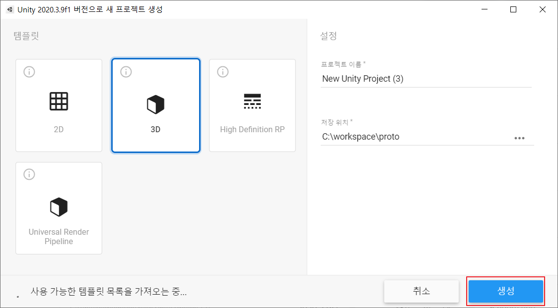 새로운 유니티 프로젝트를 생성한다.