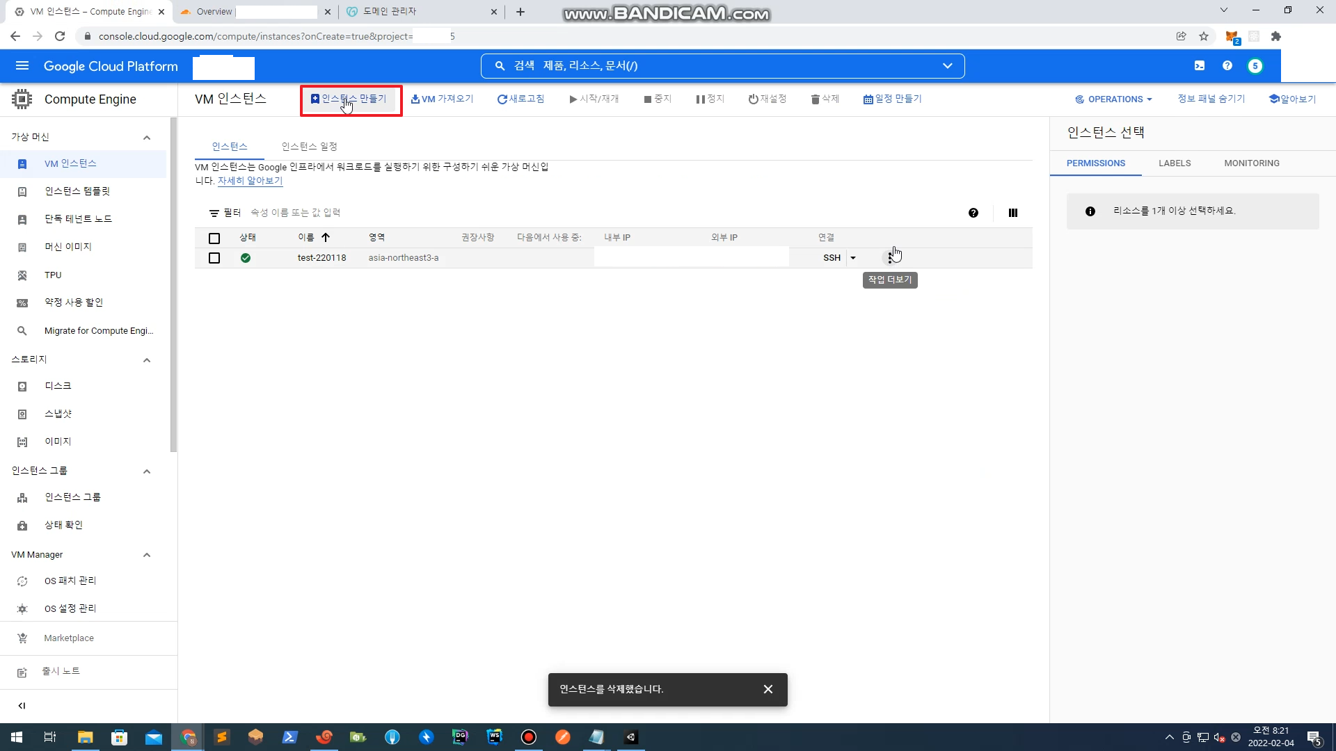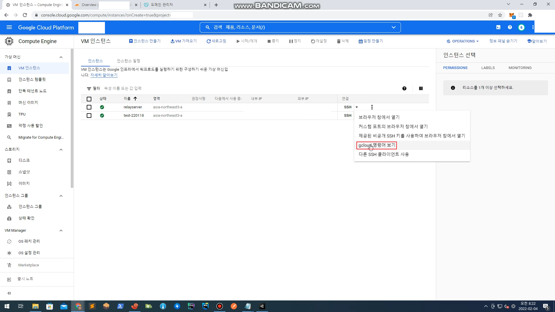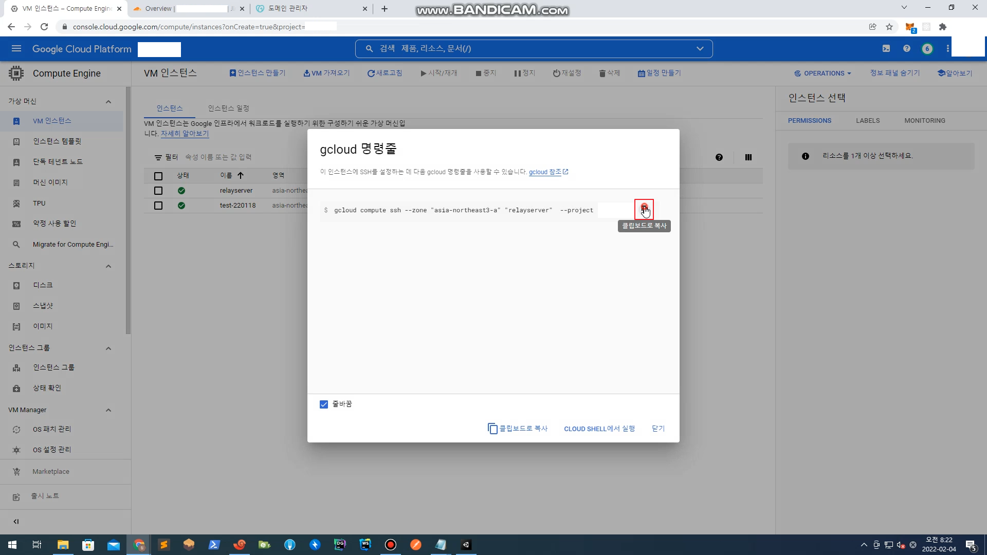인스턴스 생성되면 glcoud 명령어 보기 클릭