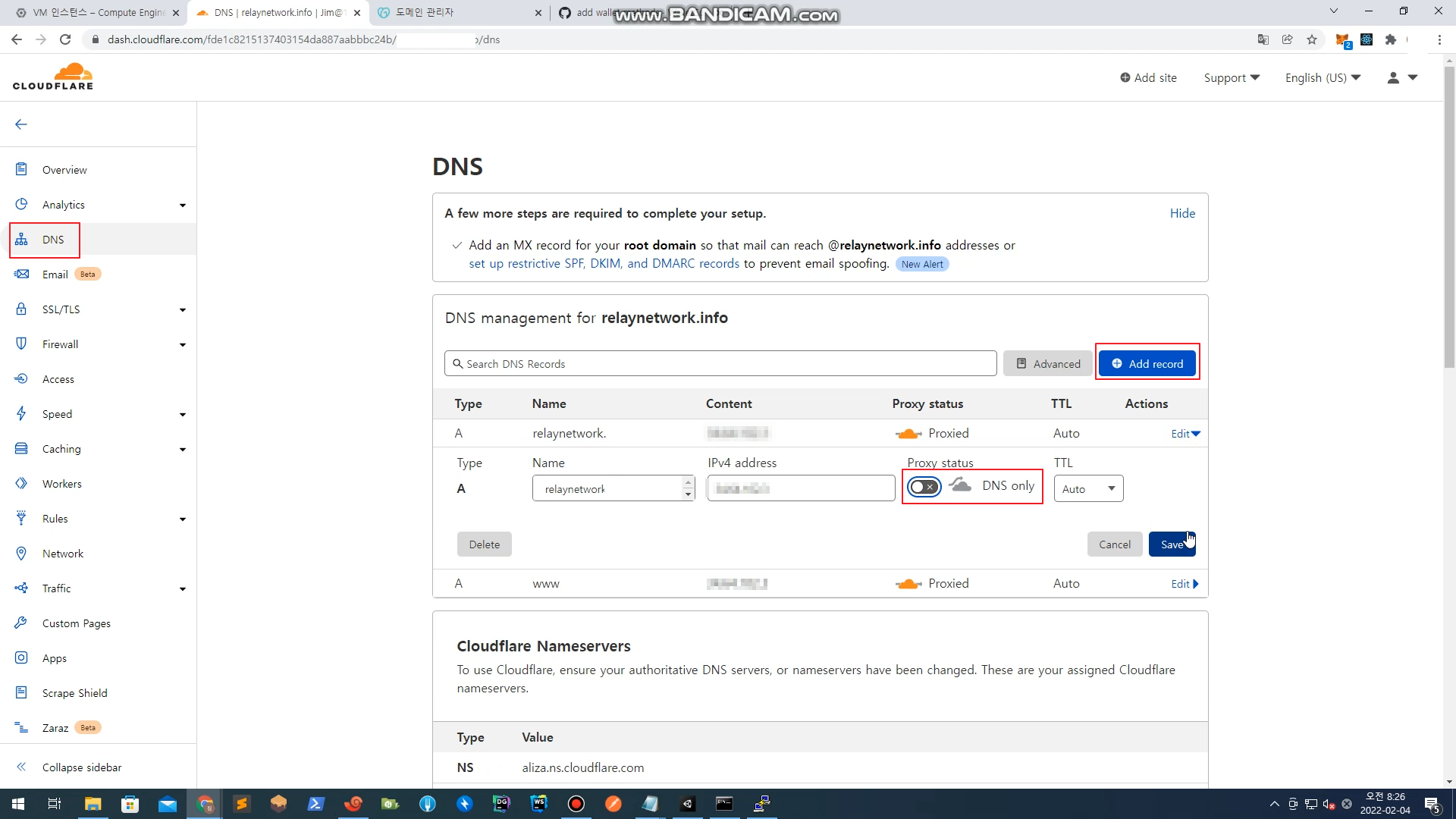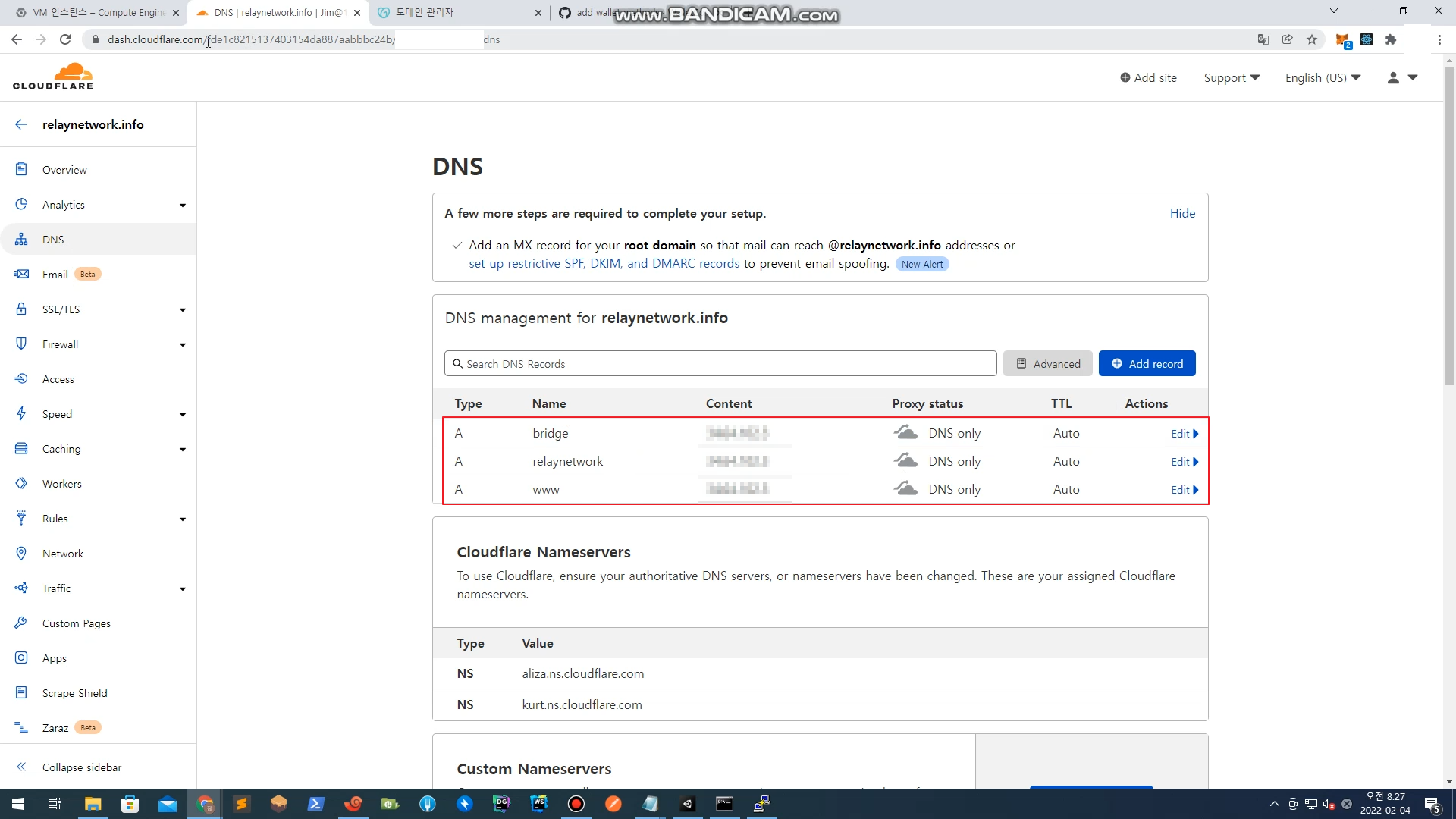 본인 도메인이 relaynetwork.com이라면 Name에 bridge, relaynetwork.com, www가 들어가야 한다.