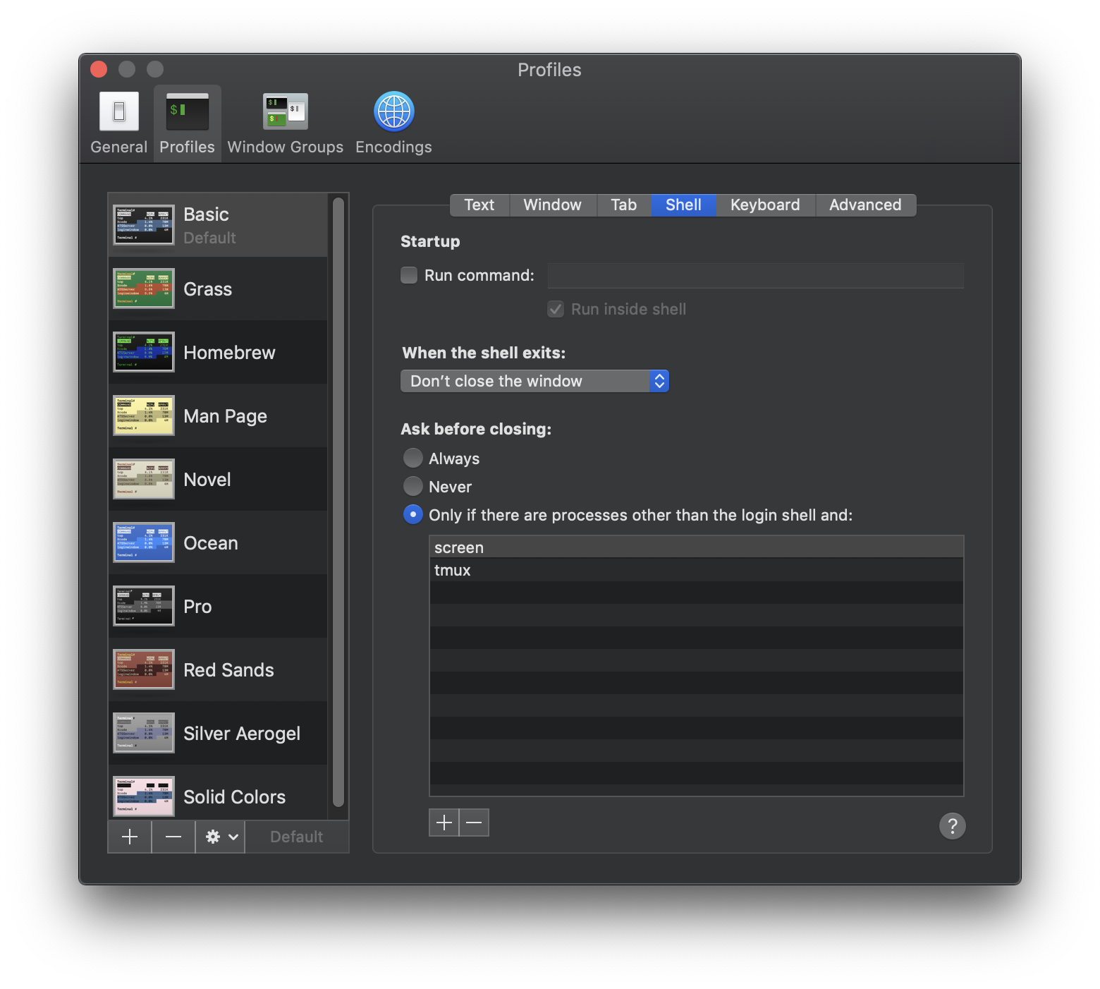 Profiles > Shell > When the shell exits: