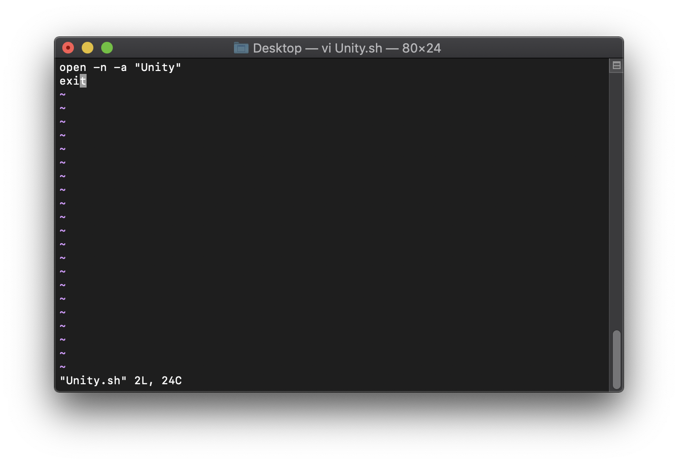 매번 터미널을 켜서 새로 유니티를 실행하는 것은 귀찮으니까 자동으로 실행해주는 바로가기 스크립트를 생성한다.