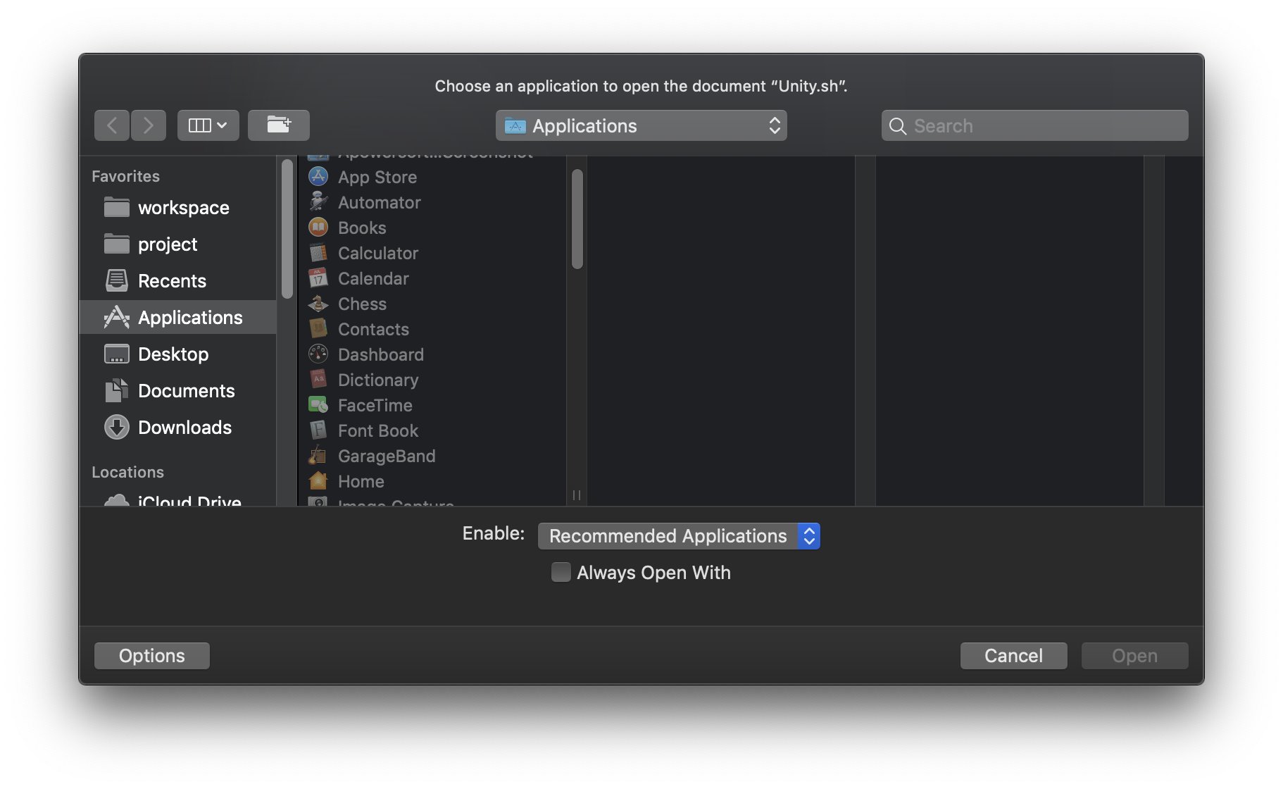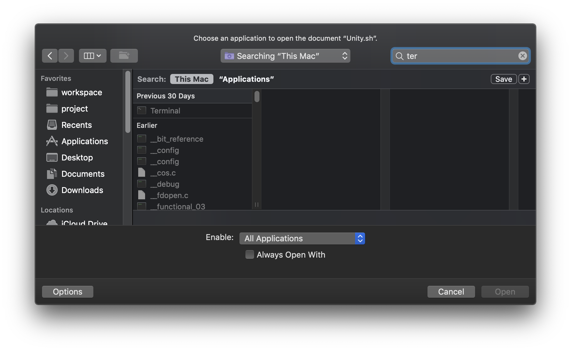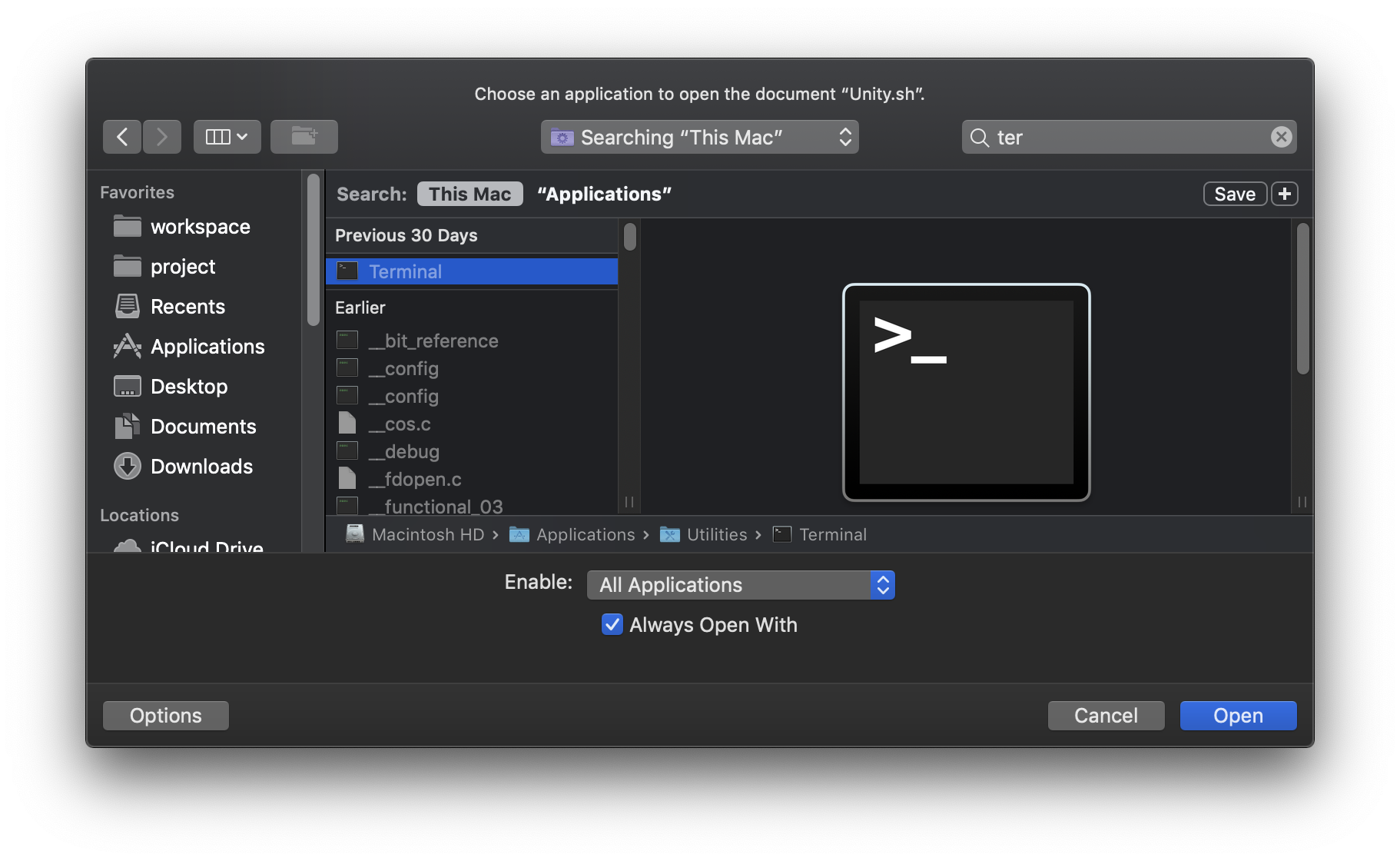 터미널 프로그램 선택 후 Always Open With를 체크하여 Open