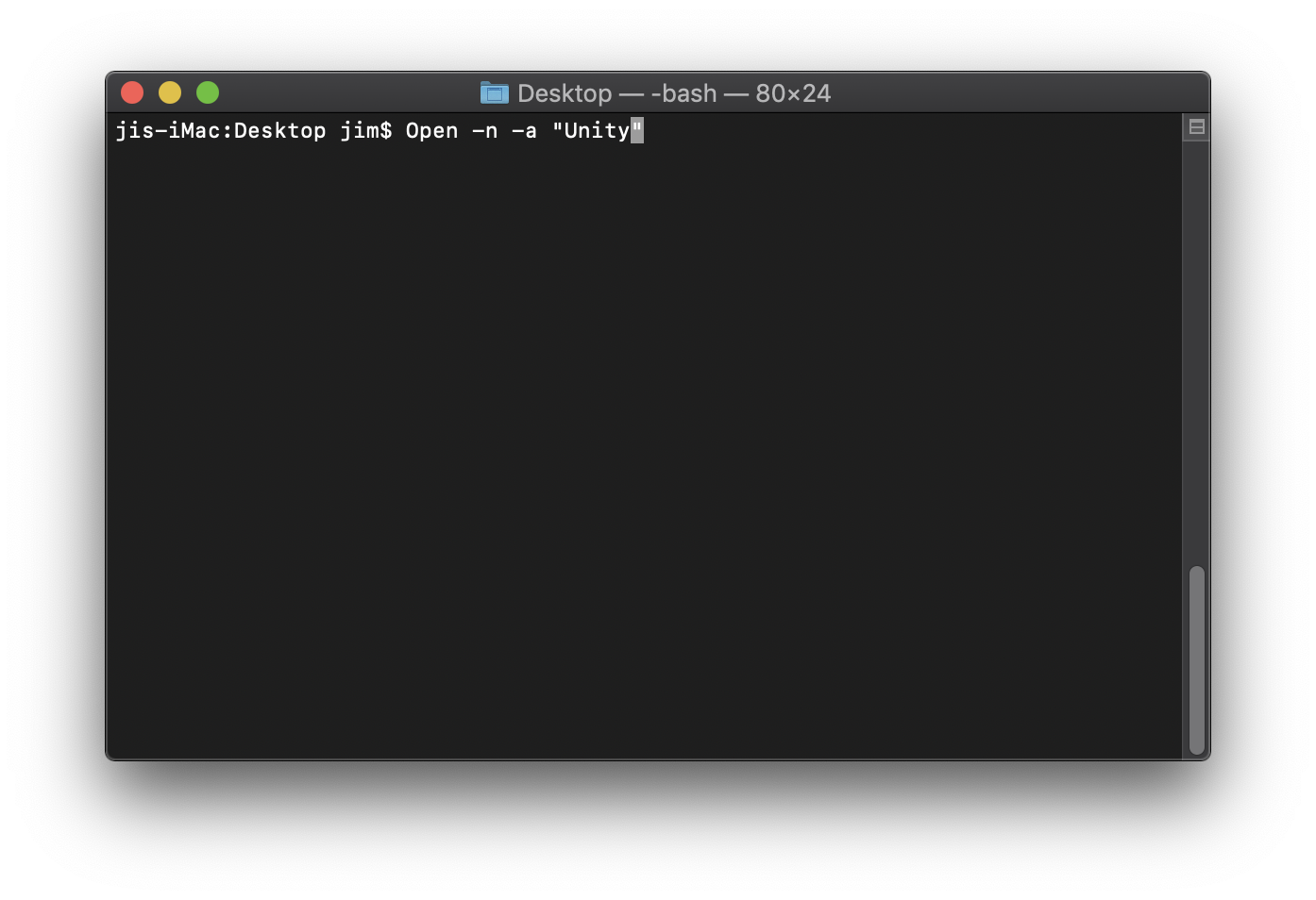 유니티를 켠다고 가정하였을 때는 Open -n -a "Unity" 로 새로운 유니티 실행