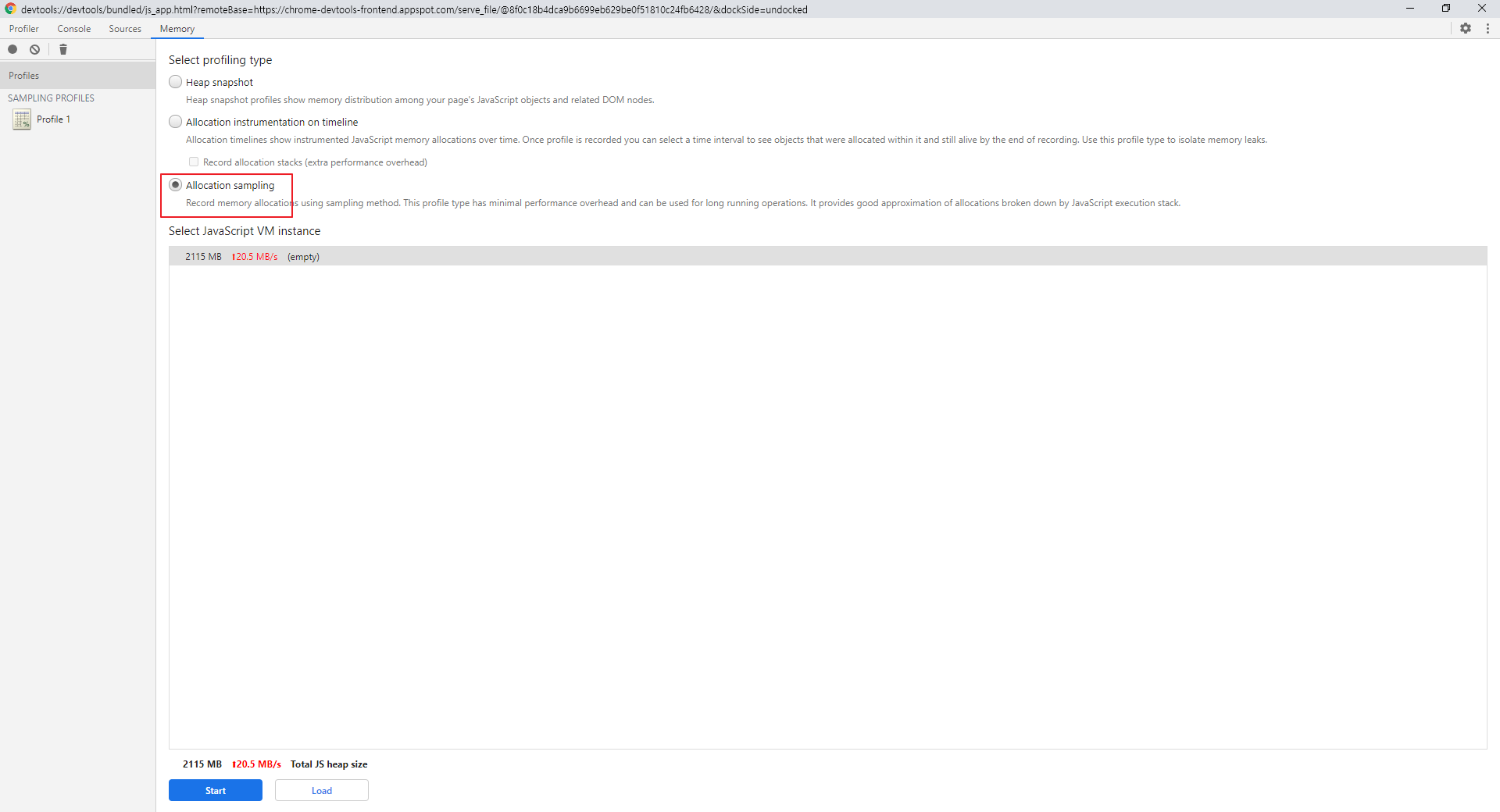 Allocation sampling은 메모리 부하를 주는 자바스크립트의 메쏘드를 살펴보는 기능이다.