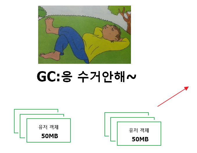 여기서 문제가 발생한다. 정체불명의 이유로 인해서 유저 50명이 접속을 종료해도 GC가 판단하기에 50명의 데이터를 담 고 있던 메모리가 아직 사용이 완료됐다고 판단하지 않아서 메모리를 수거하지 않고 계속 남아있는 것이다.