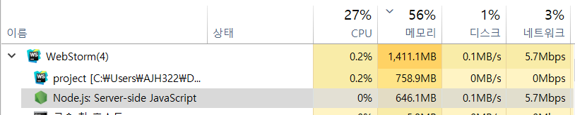 작업 관리자에서 Node가 차지하는 메모리를 보면 2000mb인 것을 볼 수 있다. 말도 안 되는 상황이지 않는가?