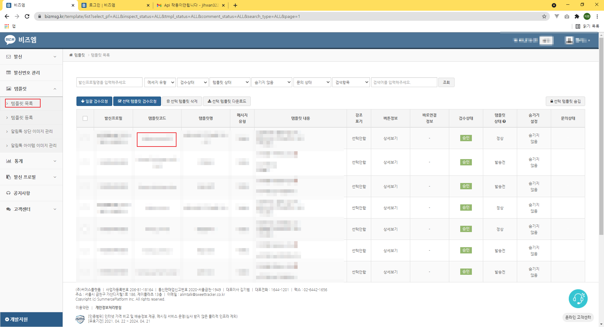 템플릿 > 템플릿 목록 > 보내고자 하는 메시지의 템플릿코드