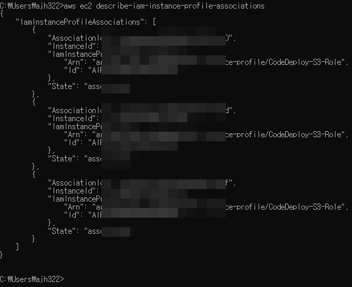 권한이 정상적으로 부여됐는지 확인하기 위해 현재 ec2 인스턴스들의 IAM 부여 정보를 확인하는 명령어를 쳐본다.