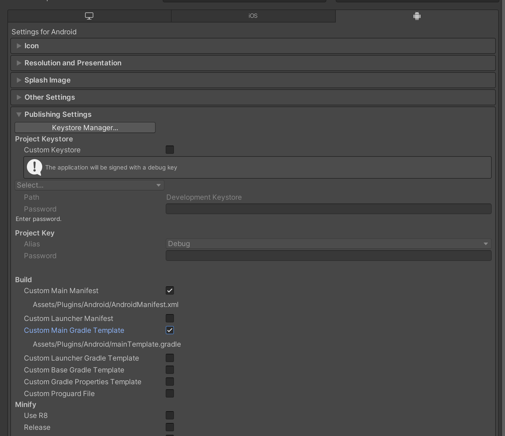 Project Settings > Player > Publishing Settings > Build > Custom Main Gradle Template 체크