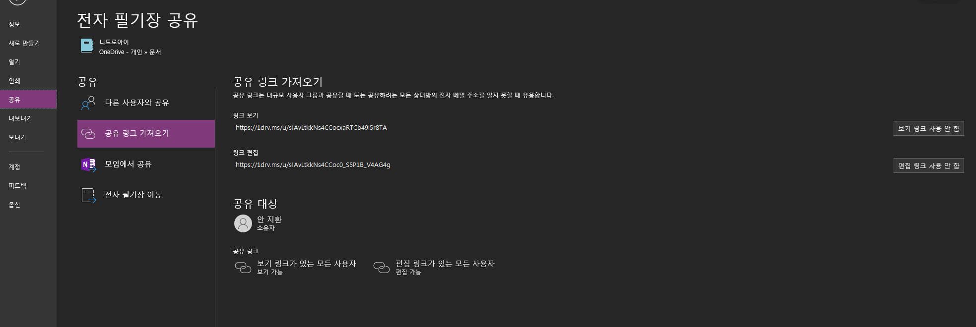 페이지 하나뿐만이 아니라 페이지가 속해있는 필기장 전체를 공유해버린다.